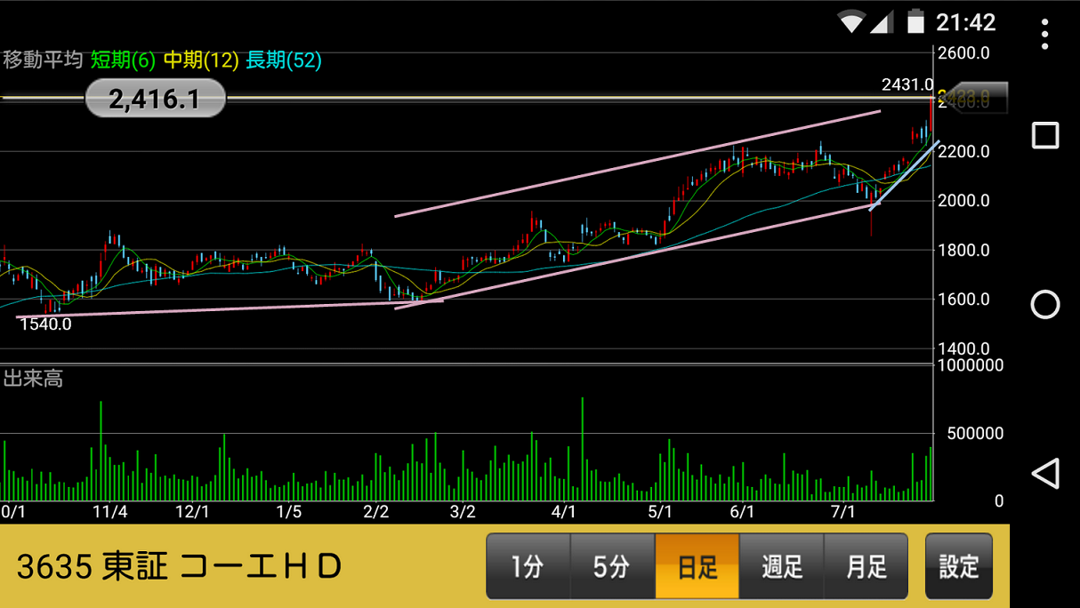 『たった7日で株とチャートの達人になる! 』という雑誌によると、これがしばらく続くらしいのでちょっと期待して見守りたいと思います。