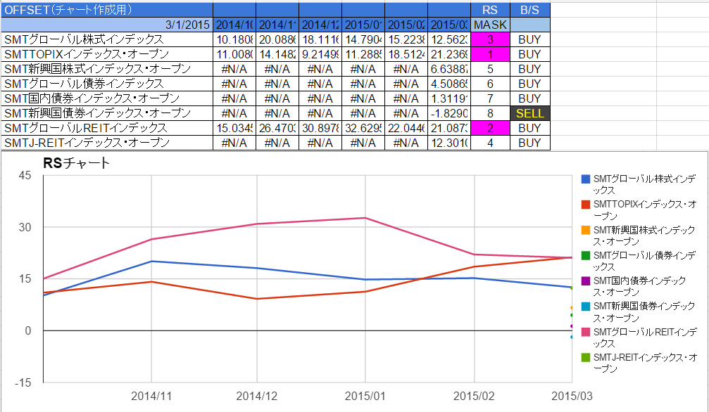 ツールには3/18の終値が入力されています。2末の時点での2位のTOPIXと3位のJ-REITのRSの結果は僅差でしたが、昨日までの時点ではTOPIXが大分上昇しているように見えます。逆にJ-REITは下降気味です。