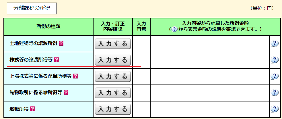 種類としては『株式等に係る譲渡所得等の~』での処理ですが、国税庁の作成コーナーではまず『分離課税』の『株式等の譲渡所得等』