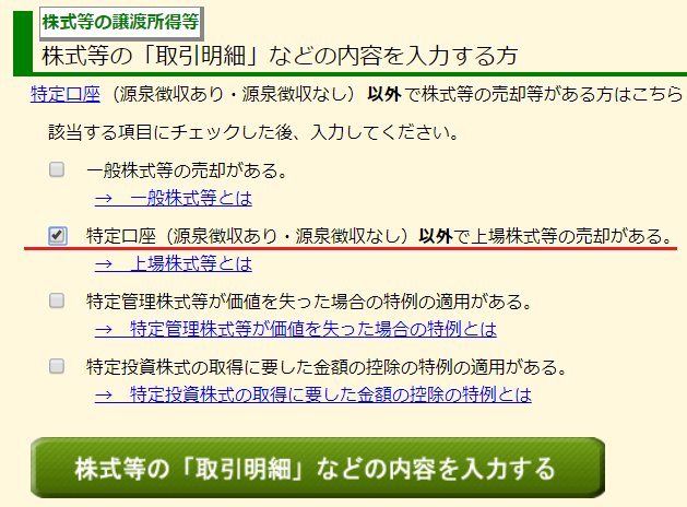 『特定口座(源泉徴収あり・源泉徴収なし)以外で上場株式等の売却がある』から記入します。